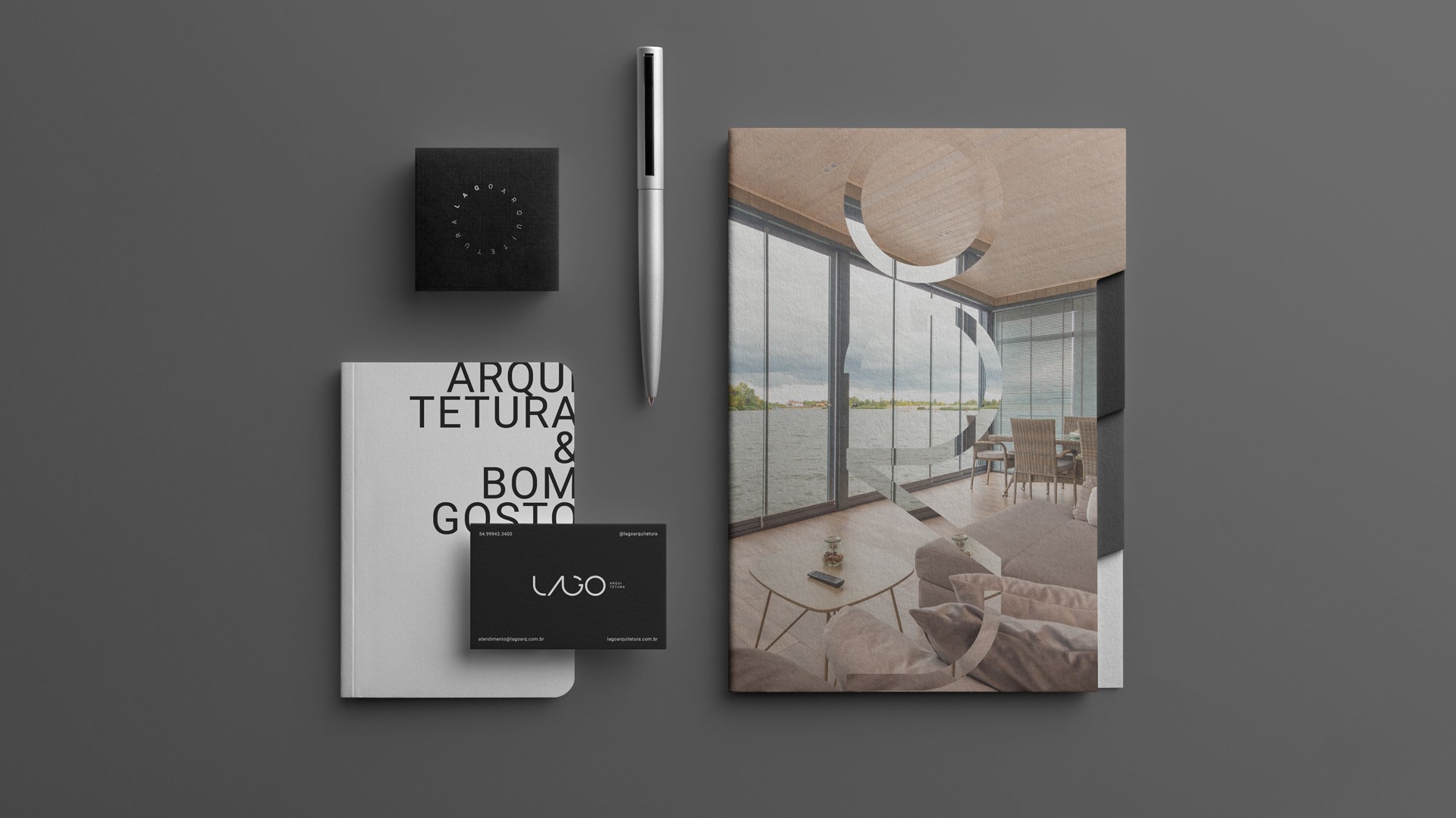 Lago Arquitetura is an architecture studio dedicated to designing spaces where precision and sensibility coexist. Their work balances technical rigor with a refined aesthetic approach, creating environments that feel both structured and serene. The challenge was to develop a visual identity capable of translating this duality — professionalism and creativity — into a clear and sophisticated brand presence